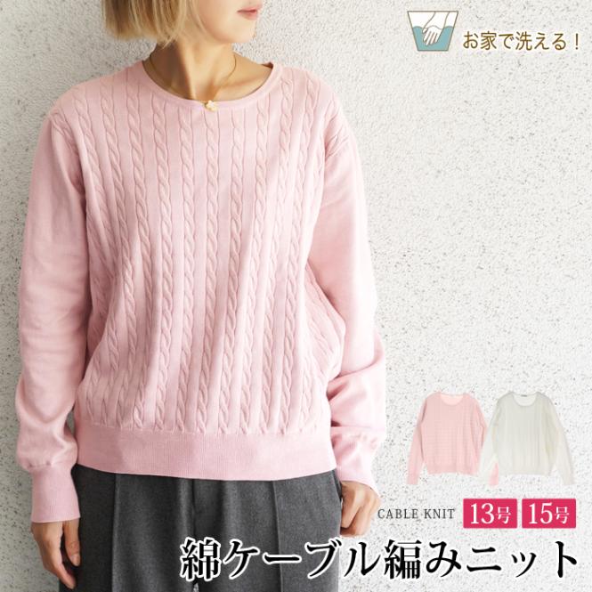 送料無料 訳あり 某ブランド タグカット ニット コットン 綿 ケーブル編み 縄編み アランニット Uネック●セーター レディース トップス 長袖 カジュアル オフィス 通勤 オフホワイト ピンク 大きいサイズ 13号[57240]