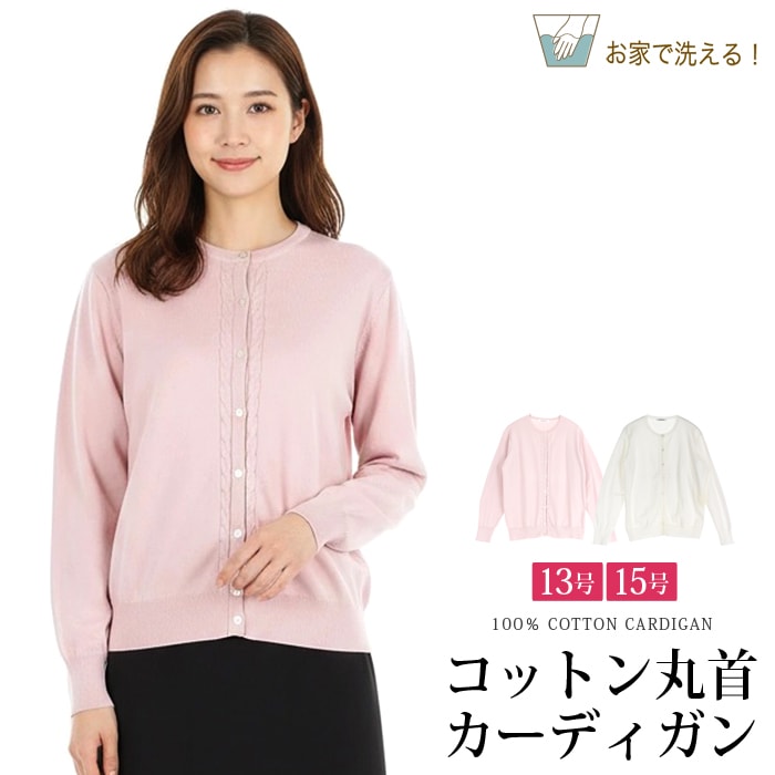 送料無料 訳あり 某ブランド タグカット カーディガン コットン 綿 丸首 ラウンドネック●レディース トップス 長袖 無地 大人 上品 シンプル カジュアル オフィス 通勤 オフホワイト ピンク 大きいサイズ 13号 15号[57239]