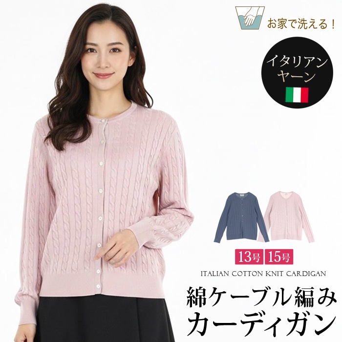 送料無料 訳あり 某ブランド タグカット カーディガン コットン 綿 ケーブル編み 縄編み アランニット イタリア糸 Uネック●レディース トップス ニット 長袖 カジュアル オフィス 通勤 ピンク ブルー 大きいサイズ 13号 15号[57237]