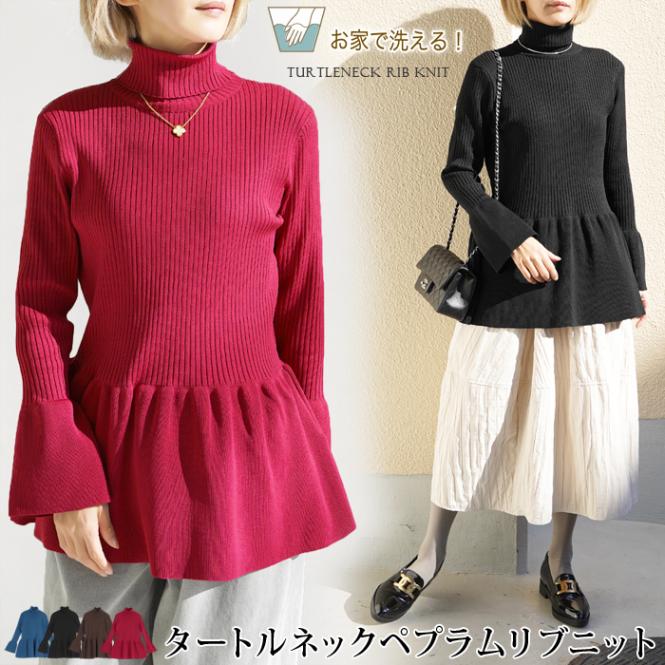 訳あり 某ブランド タグカット ニット リブ タートル ハイネック ペプラム ベルスリーブ フレアースリーブ●レディース トップス 長袖 セーター おしゃれ ブラウン ブルー ブラック パープルレッド 大きいサイズ LL[11781]