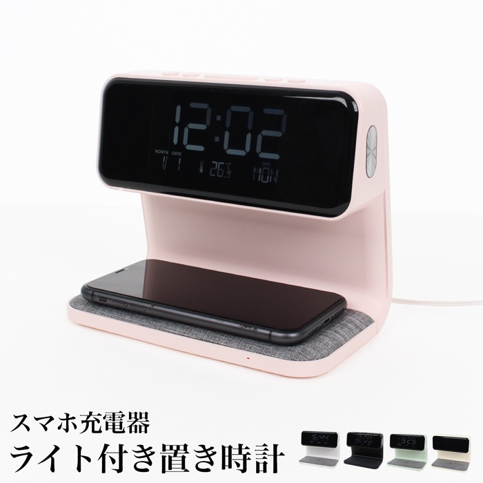 送料無料 訳あり スマホ充電ライト付き置き時計●インテリア デジタル 目覚まし時計 ワイヤレス充電 Qi対応 日付 曜日 温度 アラーム スヌーズ 無地 シンプル おしゃれ ホワイト ブラック ピンク TV通販で大人気[17396]