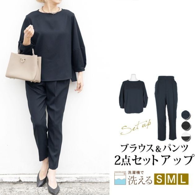 訳あり 某ブランド タグカット パンツスーツ セットアップ 2点セット 2ピース SET●七分袖 ジョーゼット レディース カラーフォーマル セレモニー 卒入学式 卒入園式 オフィス 通勤 ネイビー オフホワイト ブラック[10718]