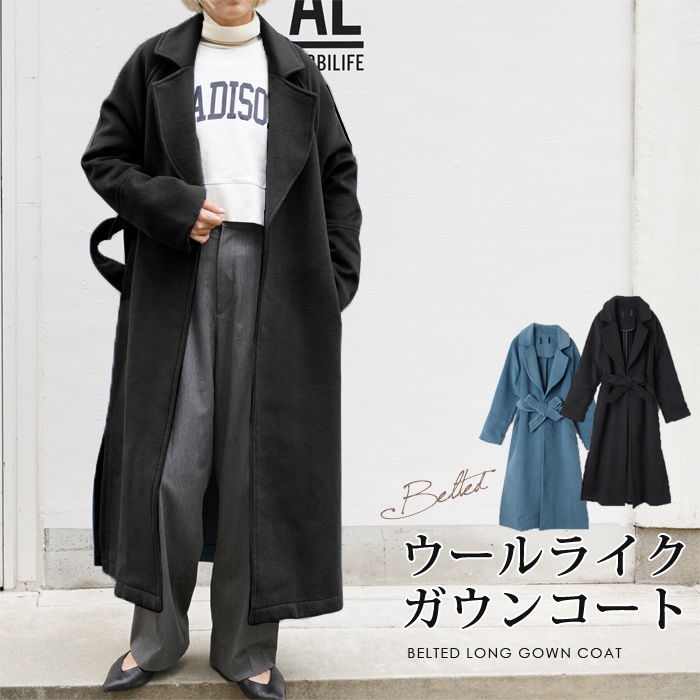 訳あり 某ブランド タグカット ガウン コート ウールライク チェスター●レディース アウター ロングコート テーラードカラー ウエストベルト スリット 長袖 上着 羽織 体型カバー ブルー ブラック [8749]