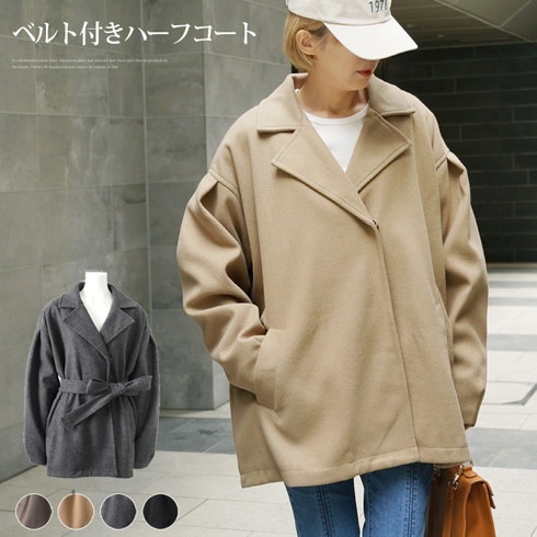 ベルト付きハーフコート♪コート レディース ハーフコート チェスターコート アウター 長袖 ゆったり オーバーサイズ シンプル ジャケット 羽織り 無地 上品 きれいめ グレージュ ベージュ ブラック モカ aw[4795]