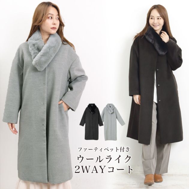 送料無料 ティペット付きウールライクロングコート♪アウター レディース コート ノーカラー ロング丈 ファーマフラー ティペット 防寒 あったか 長袖 上着 羽織 体型カバー きれいめ オフィス 通勤 ブラック グレー[5758]