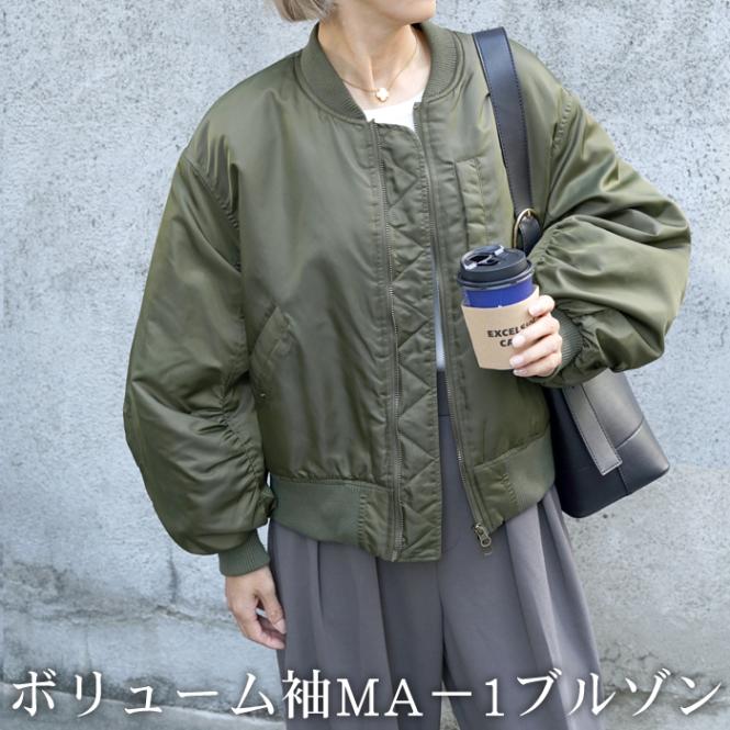ブルゾン アウター 上着 羽織り 羽織 MA1 MA-1 長袖 ボリューム袖●レディース ショートブルゾン シンプル カジュアル おしゃれ カーキ[56271]