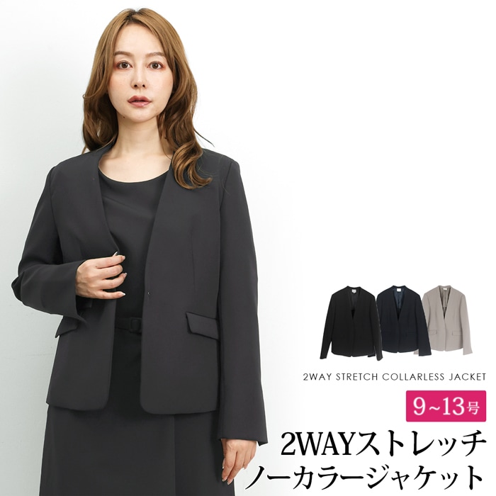 ジャケット ノーカラー 2WAYストレッチ●レディース カラーフォーマル 羽織り 長袖 おしゃれ オフィス 通勤 セレモニー オケージョン ブラック グレー ネイビー 大きいサイズ 11 13[56281]