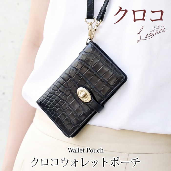 送料無料 2WAY お財布ポシェット ウォレットポーチ クロコダイル シャイニングクロコ レザー 本革 二つ折り 日本製●レディース 鞄 肩掛け お財布ショルダー ポシェット 財布 斜めかけ ブラック[58245]