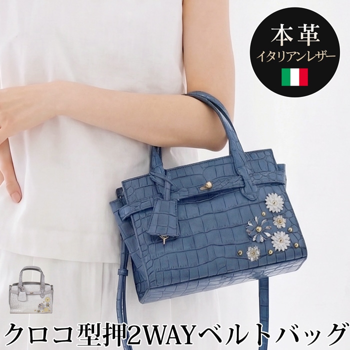 送料無料 ショルダーバッグ ハンドバッグ 牛革 本革 レザー 2WAY 型押しクロコ ベルトバッグ イタリアンレザー●レディース 鞄 フラワーモチーフ 大人 上品 カジュアル おしゃれ ヒマラヤ ブルー TV通販で大人気[58250]