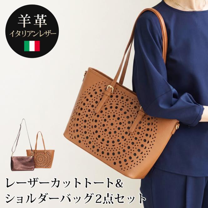 送料無料 バッグ 2点セット SET トートバッグ ショルダーバッグ 本革 牛革 イタリアンレザー レーザーカット パンチングレザー●レディース 鞄 大人 上品 カジュアル おしゃれ ブラウン TV通販で大人気[58253]