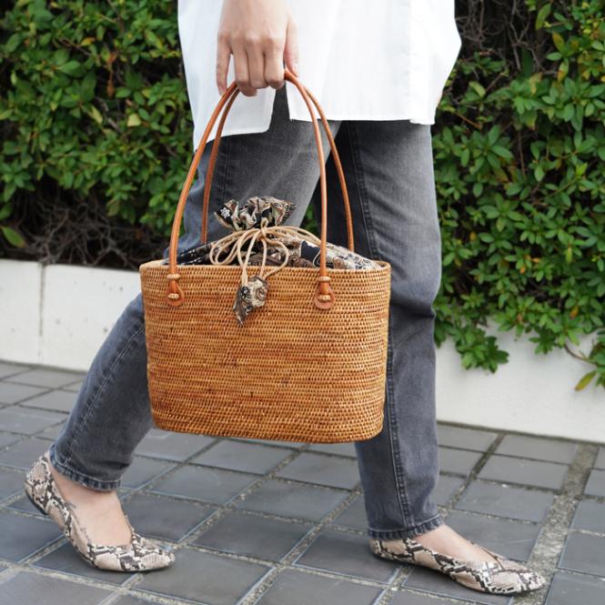 送料無料 かごバッグ アタバッグ バリ島 インドネシア シダ 手編み アジア雑貨 トートバッグ●レディース かばん 鞄 内布付き 手提げ ガムランボール付き カジュアル 浴衣 和装 おしゃれ ブラウン[57209]