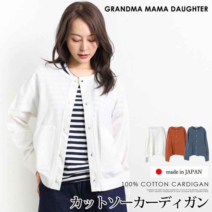 送料無料 GRANDMA MAMA DAUGHTER グランマ・ママ・ドーター カーディガン コットン 綿 長袖 日本製●レディース 羽織り スナップボタン オフィス 通勤 オフホワイト オレンジ ブルー[55272]