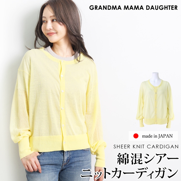 送料無料 GRANDMA MAMA DAUGHTER グランマ・ママ・ドーター カーディガン 綿混 麻混 シアーニット サマーニット Uネック●レディース トップス 薄手 羽織り 長袖 丸首 オフィス 通勤 イエロー[55276]