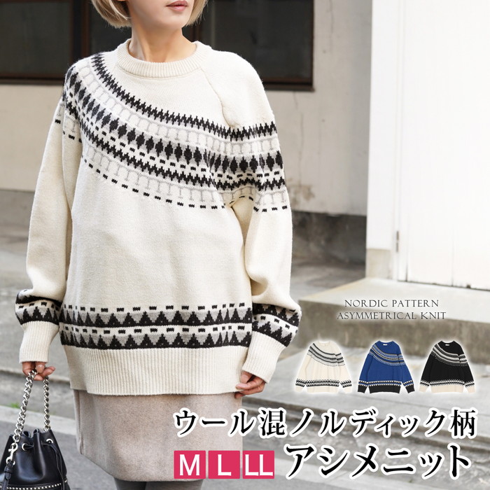 ニット ウール混 ノルディック柄 フェアアイル柄 北欧柄●レディース セーター 長袖 大人 上品 シンプル カジュアル おしゃれ オフホワイト チャコール ブルー 大きいサイズ LL[11773]