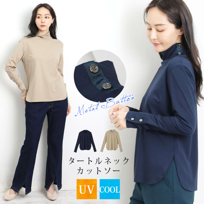 訳あり 某ブランド タグカットのため COOL ボタンタートル カットソー●ハイネック 長袖Tシャツ ロンT タートルネック インナートップス レディース UVカット 接触冷感 ストレッチ ネイビー グレージュ 大きいサイズ LL[8773]