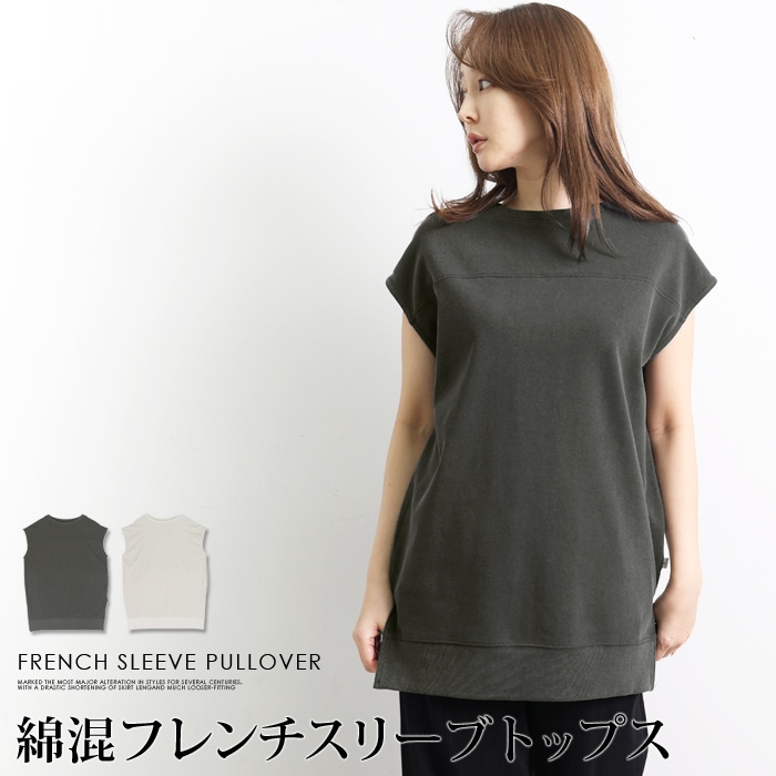 トップス フレンチスリーブ キャップスリーブ 綿混 コットン Tシャツ プルオーバー●レディース カットソー クルーネック 半袖 シンプル ナチュラル カジュアル チャコール ベージュ[54295]