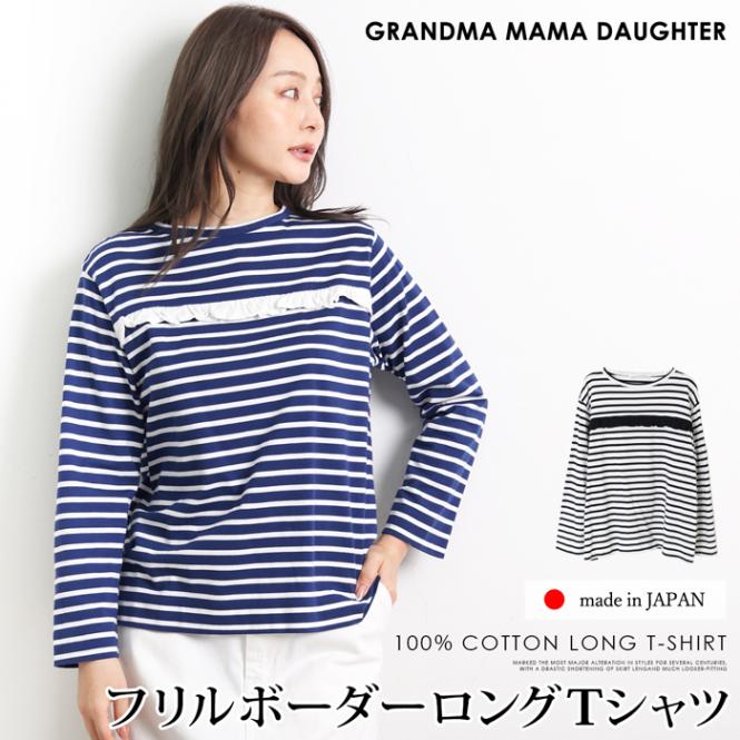 送料無料 GRANDMA MAMA DAUGHTER グランマ・ママ・ドーター ロンT Tシャツ ボーダー コットン 綿●カットソー レディース トップス フリル ラウンドネック 七分袖 日本製 ブラック ブルーー[55269]