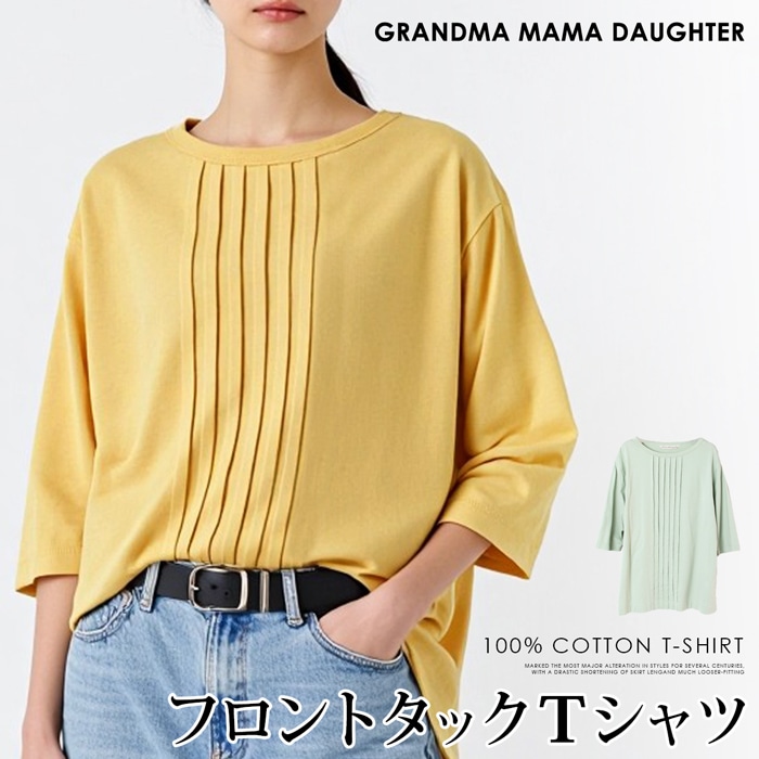 送料無料 GRANDMA MAMA DAUGHTER グランマ・ママ・ドーター Tシャツ ロンT コットン 綿 日本製●カットソー レディース トップス フロントタック 五分袖 オフィス 通勤 グリーン イエロー[55271]