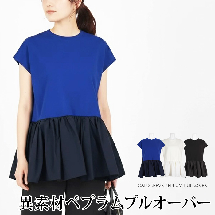 トップス プルオーバー カットソー ブラウス 異素材 ペプラム キャップ袖●レディース 半袖 無地 大人 上品 カジュアル おしゃれ オフホワイト ブラック ブルー 大きいサイズ LL【メール便可】[11776]