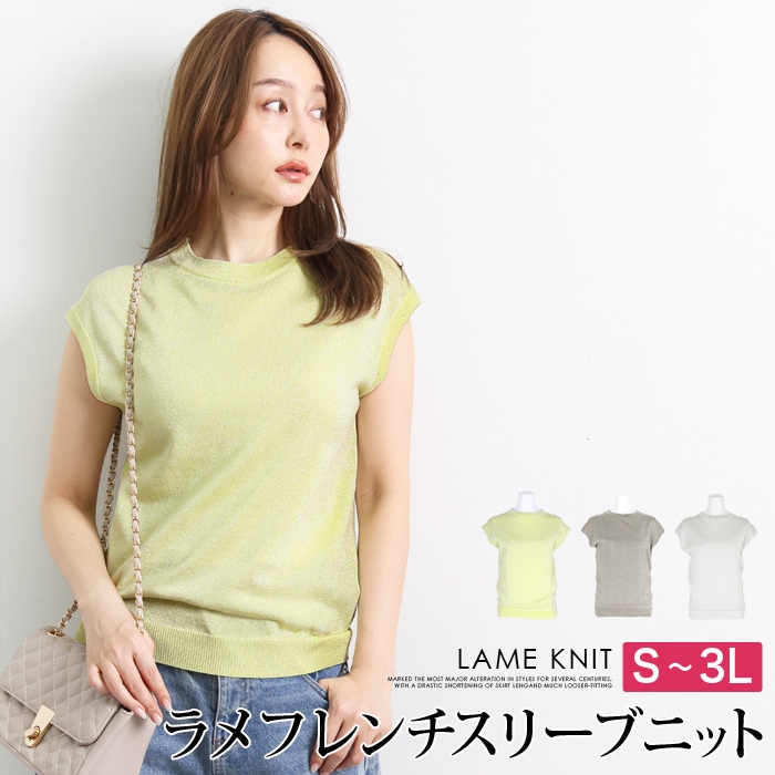 訳あり 某ブランド タグカット ニット キャップ袖 フレンチスリーブ ノースリーブ ラメ混 レーヨン●レディース トップス クルーネック 半袖 カジュアル オフィス 通勤 オフホワイト モカ イエロー 大きいサイズ LL 3L[55218]【メール便可】