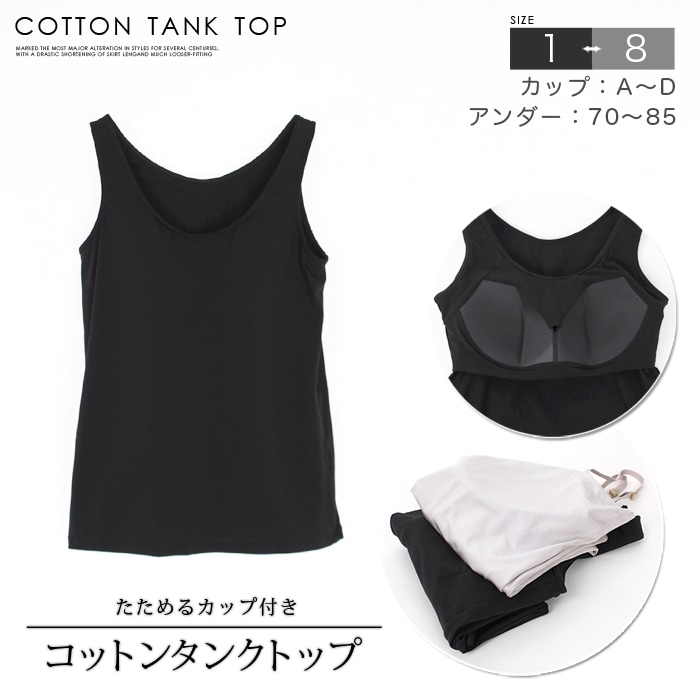 たためるカップ付きコットンタンクトップ●ブラトップ インナー 綿 ドライタッチ レディース トップス たためる ペチコート ランジェリー キャミ キャミソール ブラック 大きいサイズ A B C Dカップ【メール便可】[11727]