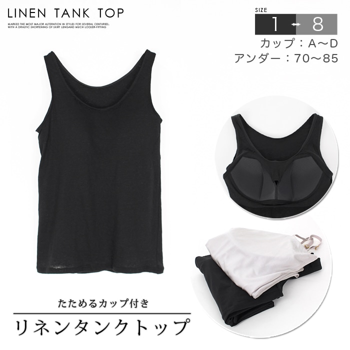 たためるカップ付きリネンタンクトップ●カップ付き 麻 ブラトップ インナー レディース トップス肌着 ペチコート ランジェリー キャミ キャミソール ブラック 大きいサイズ A B C Dカップ【メール便可】[11729]