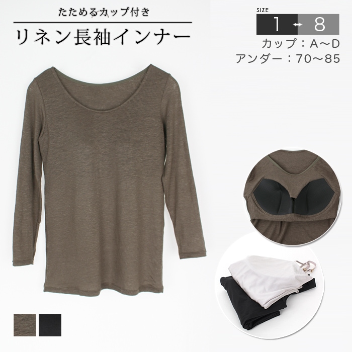 たためるカップ付きリネン長袖インナー●インナー 麻 肌着 七分袖 Uネック レディース 部屋着 トップス肌着 ペチコート ランジェリー キャミソール ブラック カーキ 大きいサイズ A B C Dカップ【メール便可】[11730]