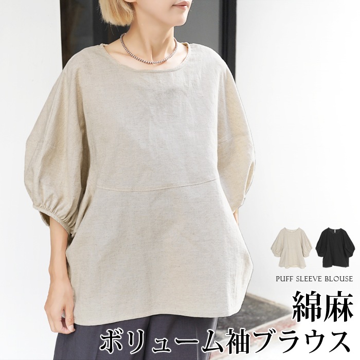 ブラウス 半袖 綿麻 コットン リネン パフスリーブ●トップス レディース 大人 上品 シンプル カジュアル ナチュラル おしゃれ オフィス 通勤 ベージュ ブラック[55240]【3980円以上送料無料】