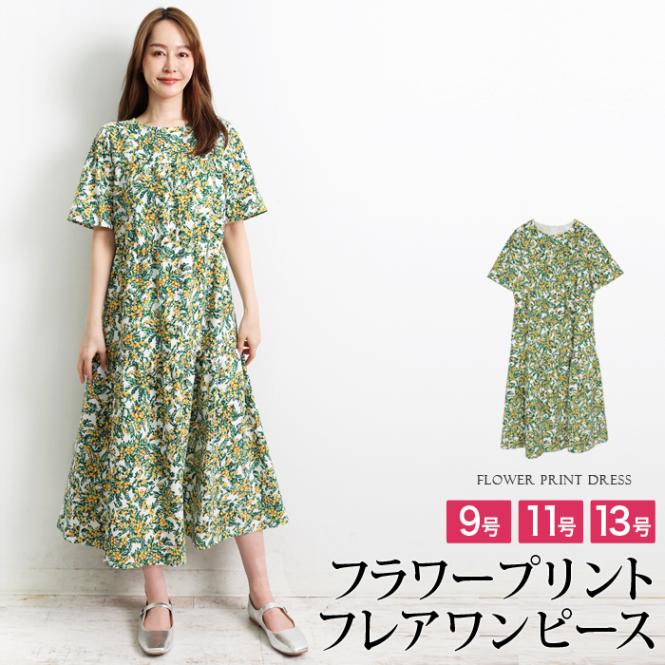 送料無料 訳あり某ブランド タグカット ワンピース ロング 半袖 フラワープリント 花柄 日本製● レディース ミモレ丈 フレア Aライン 洗える 大人 上品 シンプル カジュアル おしゃれ オケージョン イエロー 大きいサイズ 13号[54223]