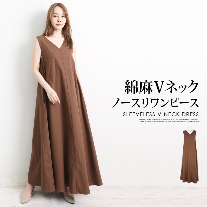 ワンピース マキシ丈 ロング フレア ノースリーブ 綿麻 コットン リネン Vネック●レディース Aライン 無地 大人 上品 カジュアル シンプル ナチュラル おしゃれ ブラウン[54276]【3980円以上送料無料】