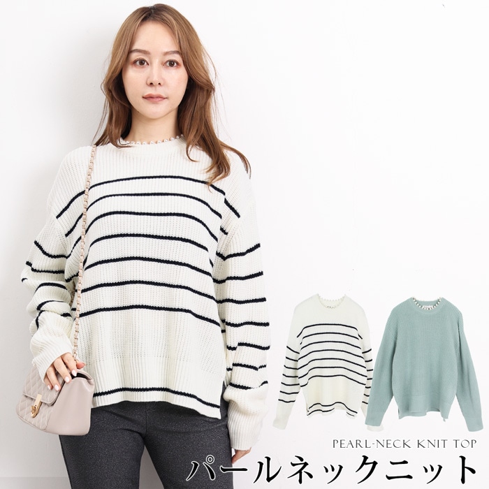 ニット セーター パール 長袖 ボリューム袖 Uネック●レディース トップス 洗える カジュアル ベーシック おしゃれ オフィス 通勤 ボーダー ミント 大きいサイズ LL[10701]【3980円以上送料無料】