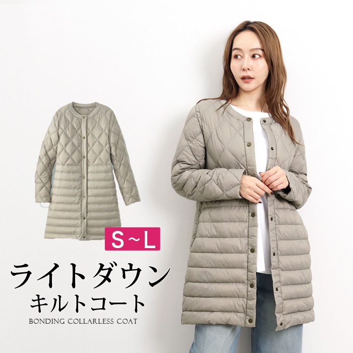 ダウンコート ダウンジャケット ライトダウン ダウン90% ノーカラー 軽量●レディース アウター キルティング ロング あったか 防寒 オフィス 通勤 グレージュ[11743]【3980円以上送料無料】