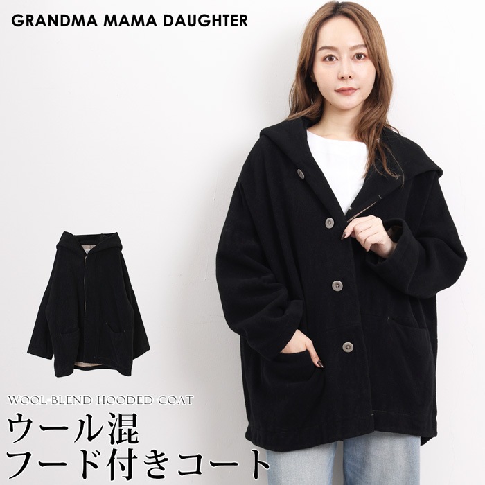 送料無料 GRANDMA MAMA DAUGHTER グランマ・ママ・ドーター コート ハーフコート ウール混 フード付き●レディース アウター 防寒 大人 上品 シンプル カジュアル おしゃれ オフィス 通勤 ブラック[56228]
