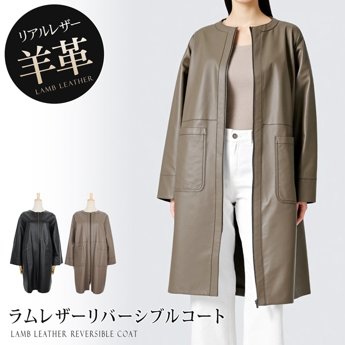 送料無料 コート リバーシブル 2WAY ラムレザー 羊革 本革 ノーカラー●レディース アウター ロング 長袖 無地 大人 上品 シンプル カジュアル おしゃれ ブラック トープ TV通販で大人気[55241]【3980円以上送料無料】