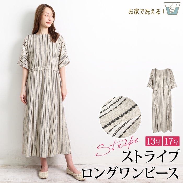 送料無料 訳あり某ブランド タグカット ワンピース ロング マキシ 半袖 ストライプ●レディース フレア Aライン サックドレス 大人 上品 シンプル カジュアル おしゃれ ベージュ 大きいサイズ 13号 17号[54227]【3980円以上送料無料】