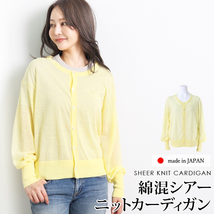 送料無料 GRANDMA MAMA DAUGHTER グランマ・ママ・ドーター カーディガン 綿混 麻混 シアーニット サマーニット Uネック●レディース トップス 薄手 羽織り 長袖 丸首 オフィス 通勤 イエロー[55276]