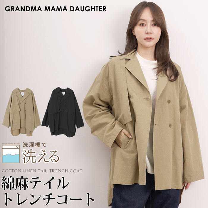 送料無料 GRANDMA MAMA DAUGHTER グランマ・ママ・ドーター コート トレンチ コットン 綿麻 リネン 洗える●レディース アウター ジャケット 羽織り ミドル丈 長袖 通勤 ブラック ベージュ[56225]