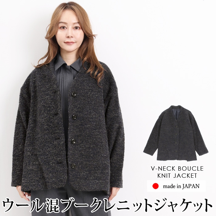 送料無料 ジャケット ノーカラー Vネック ブークレ 日本製●レディース アウター 羽織り 無地 大人 上品 シンプル カジュアル おしゃれ オフィス 通勤 ネイビー 大きいサイズ LL 3L[57204]