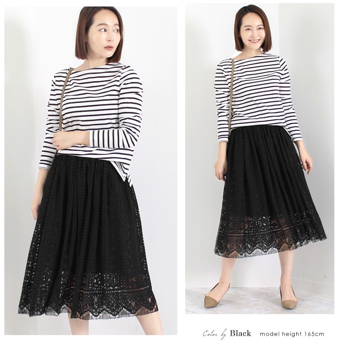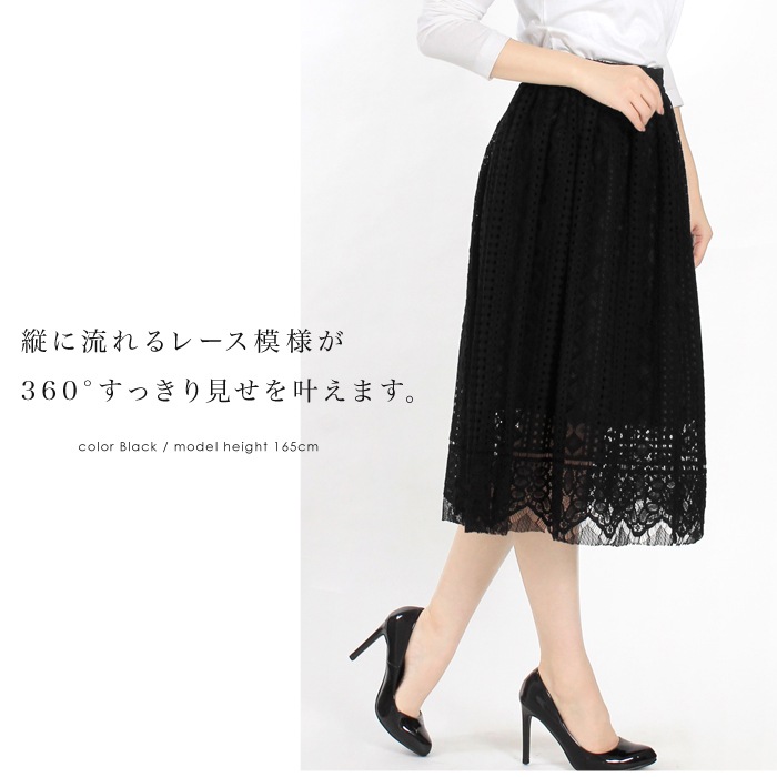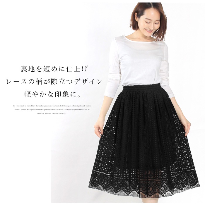 レースをたっぷり使った贅沢な総レーススカート。 ハリのある生地感なので、きれいなフレアシルエットを描きます☆ あえて裏地を膝上の長さに調節し、 レースの美しさが引き立つように仕上げました! ウエストゴム入りで、快適な履き心地も追求☆ 複数のレースを使用しているので表情のある1着に。 デイリーにオフィスに。様々なシーンで活躍する、 優秀スカートです♪ ○サイズ: 《フリーサイズ》 総丈/(約)72cm(レース部分含む) ウエスト/(約)62cm ヒップ/(約)130cm ○材質:表地/コットン65% ナイロン35% 裏地/ポリエステル 100% ○生産国:中国 ○洗濯表示:ドライのみ