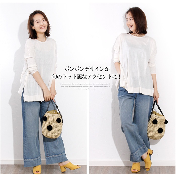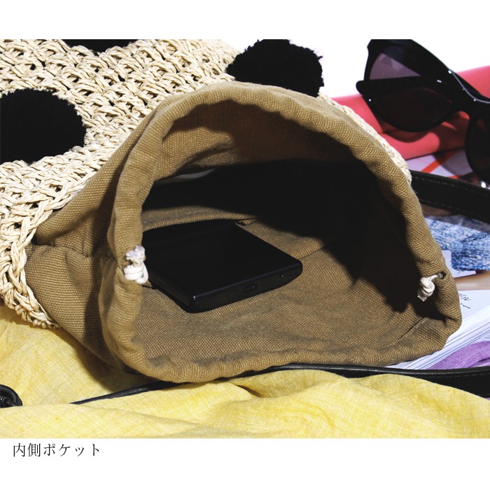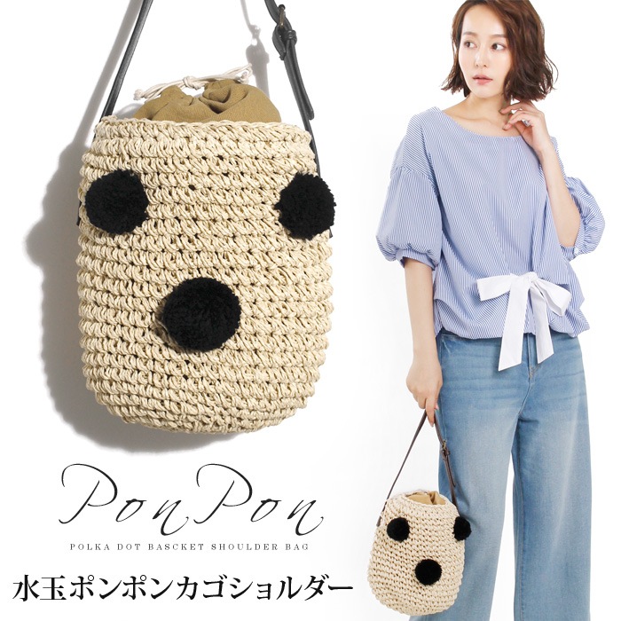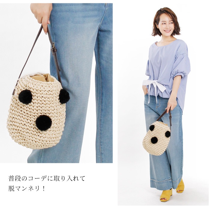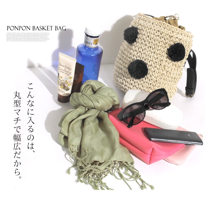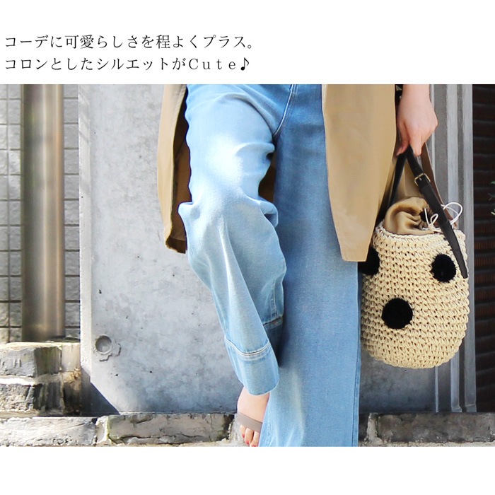 かごバッグ ハンドバッグ レディース カゴバッグ 巾着 ショルダーバッグ ストローバッグ カバン 鞄 かばん バッグ かわいい おしゃれ カジュアル 5510 丸型マチでたっぷり入る、ポンポン付きかごバッグが登場♪ 旬なドット風にも見えるポンポンがアクセントになり、 今までのかごバッグとはまた違ったデザインに仕上がっています。 巾着タイプの開閉なので中が見えたり落ちたりする心配も無し! ストラップはベルトタイプで調節が出来るので、 コーデに合わせてお好みのスタイルでお持ちすることができますよ♪ カジュアルで使いやすく季節感溢れるバッグ、とってもオススメです☆ ○サイズ: 本体/(約)縦20×横22×マチ13cm ショルダー長さ/(約)最短54-最長64 cm (ショルダーベルト取り外し/不可) ○重量:(約)275g ○スペック: 開閉/巾着開閉 内側/オープンポケット×1個 ○材質:ペーパー ○生産国:中国