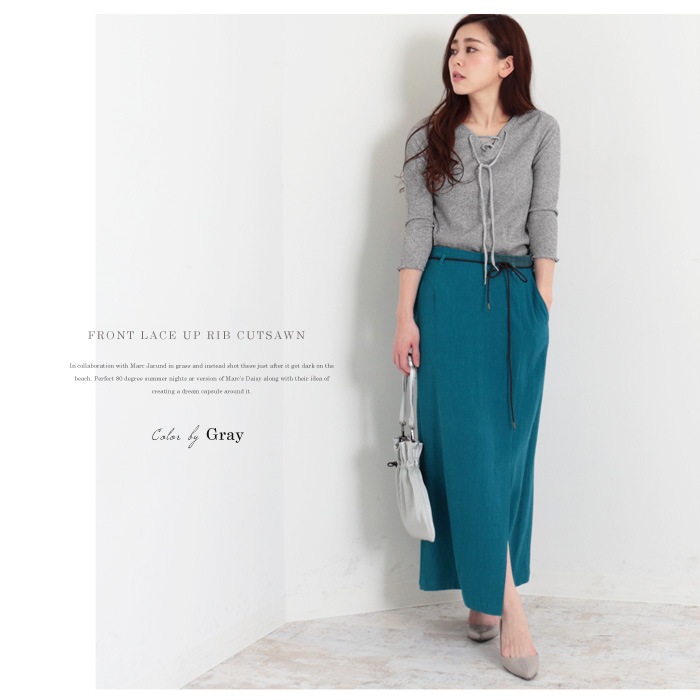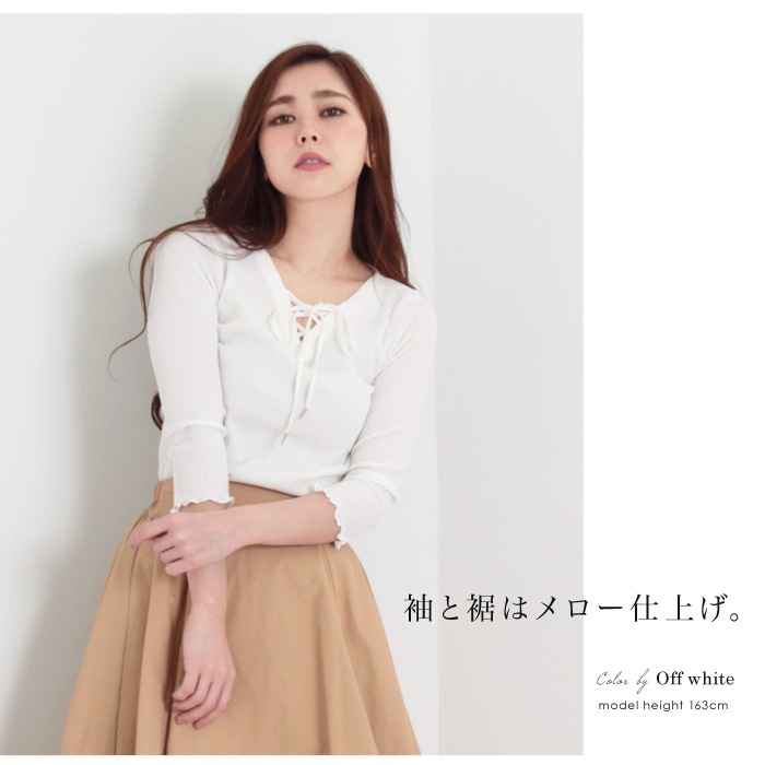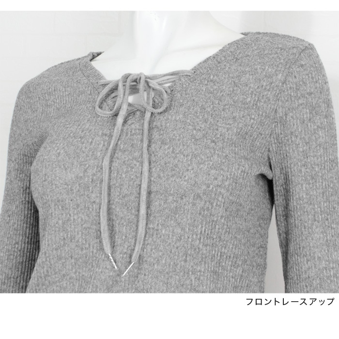 フロントにあしらったレースアップデザインがポイントのリブ編みトップス。