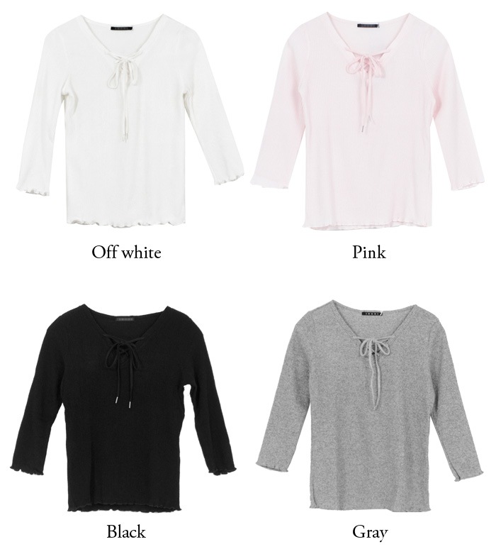 フロントレースアップリブTシャツ♪カットソー 七分袖 レディース トップス リブ編み Vネック おしゃれ 大人 上品 ブラック ホワイト ピンク グレー