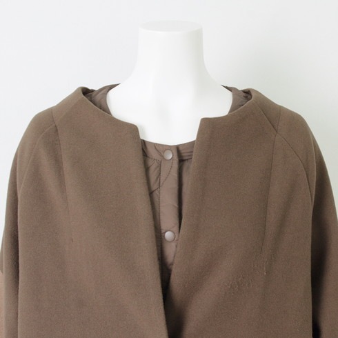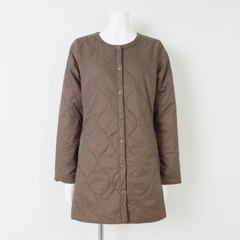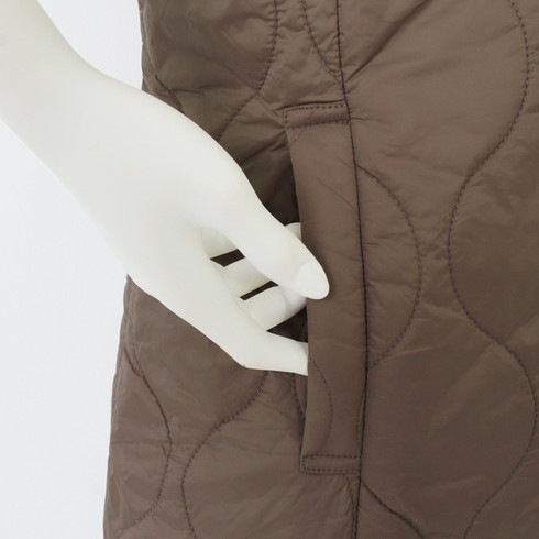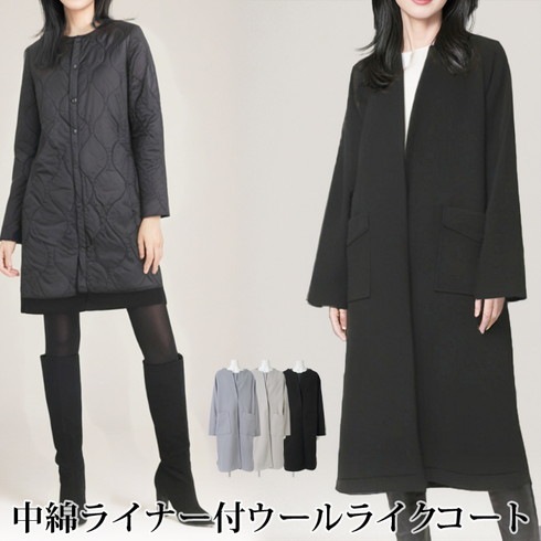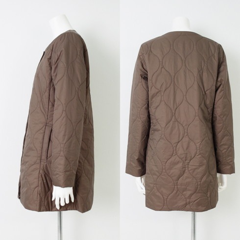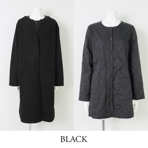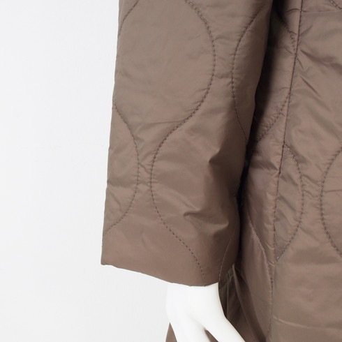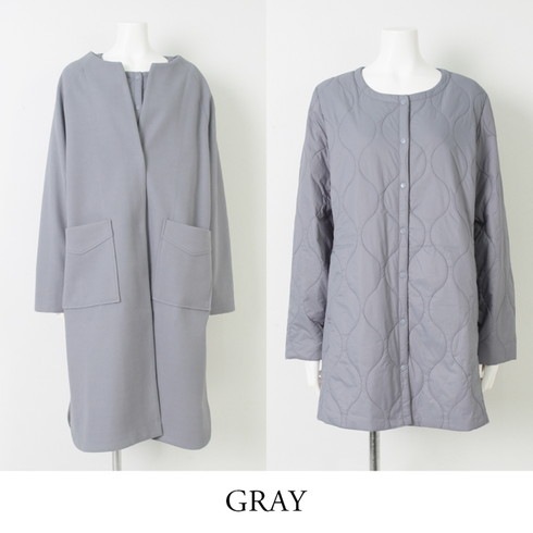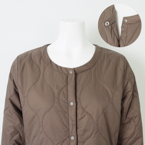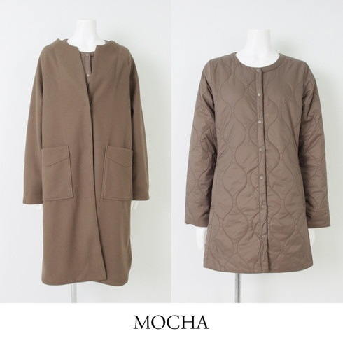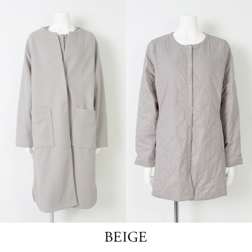 ナイロンタフタの中綿キルトライナーをセットにしたアンサンブル。