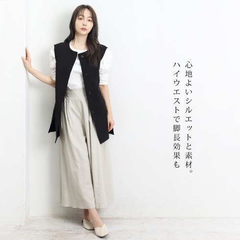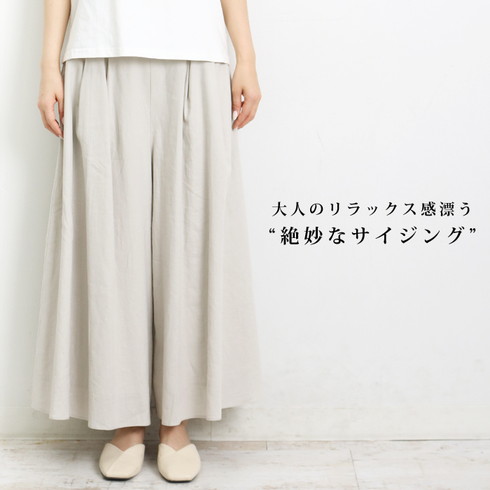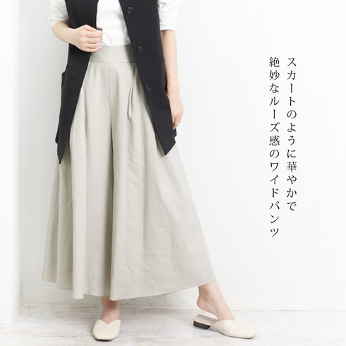 フレアシルエットでスカート見えのするワイドパンツ。