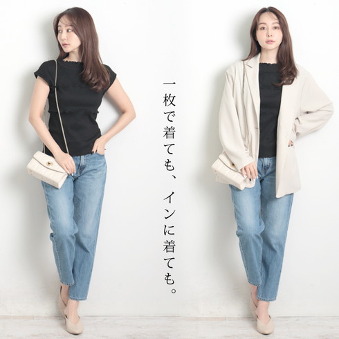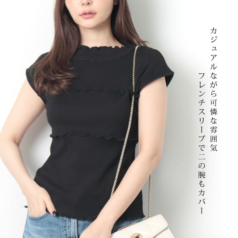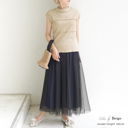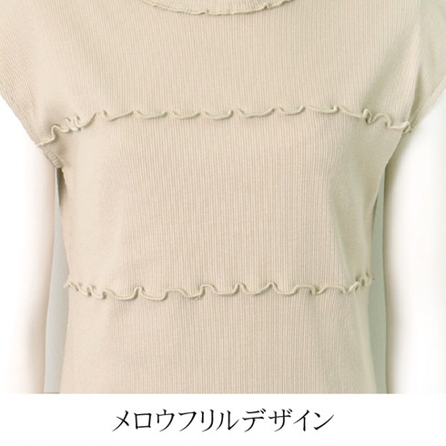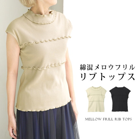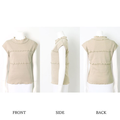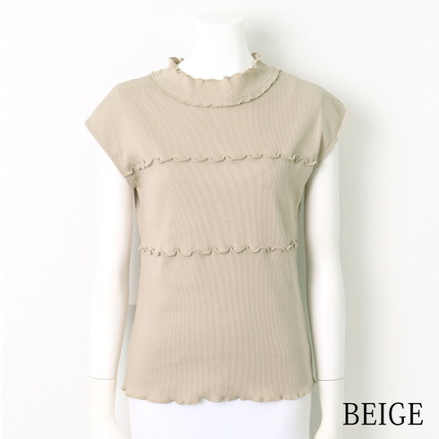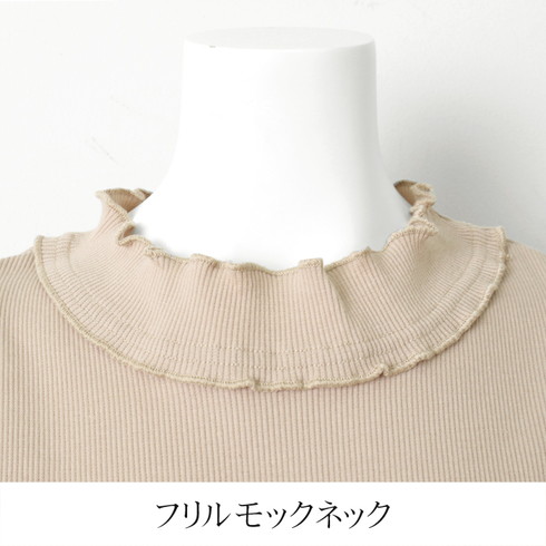 ハイネックと胸元のメロウフリルが印象的なリブトップスです。