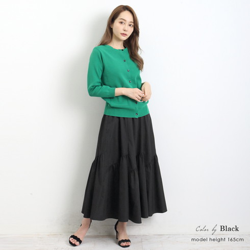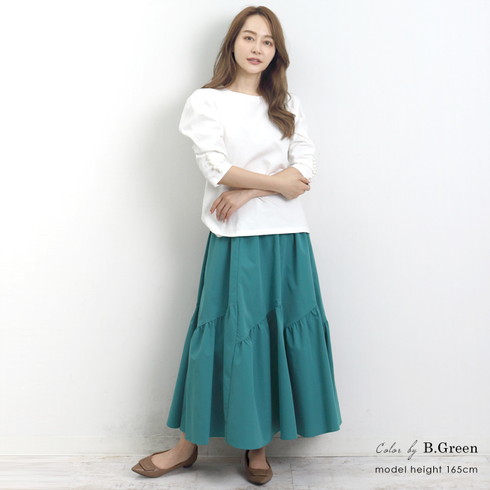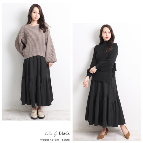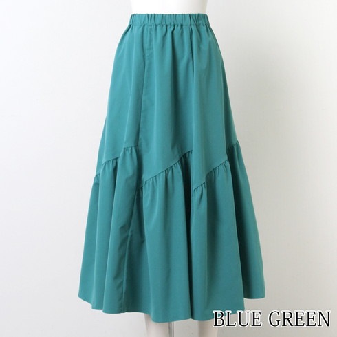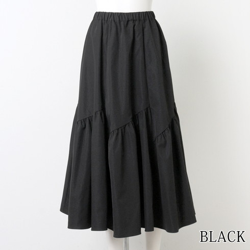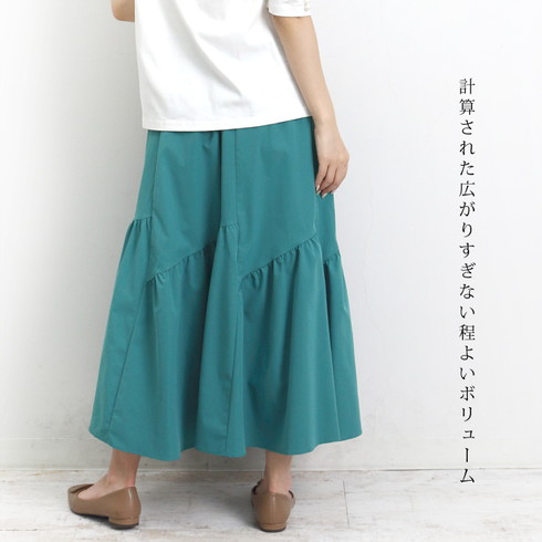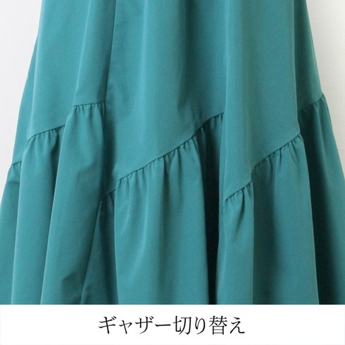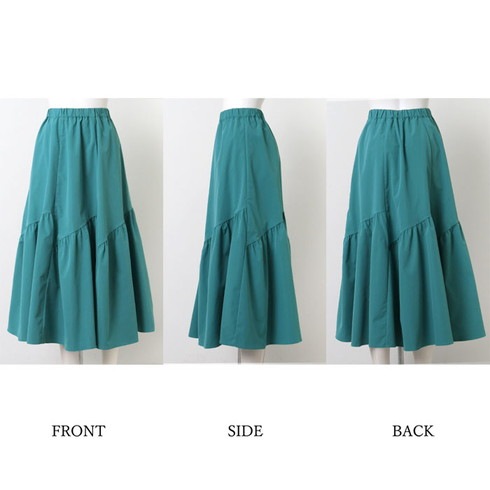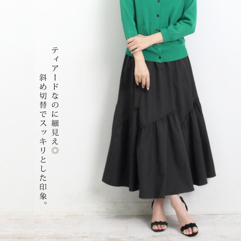 斜め切替のティアードスカート&ふんわりフレアデザインで女性らしいフェミニンな印象にしてくれます。