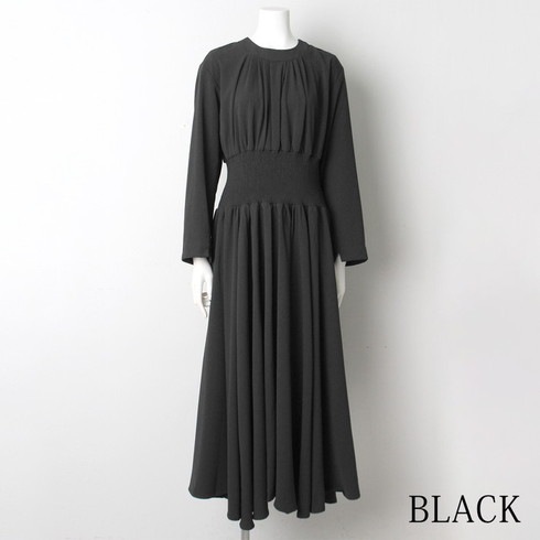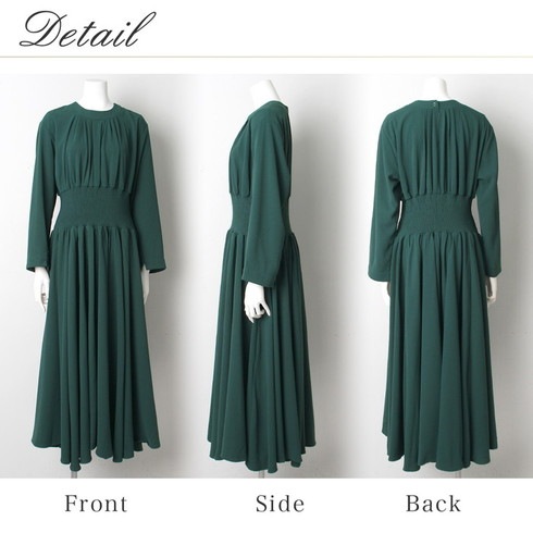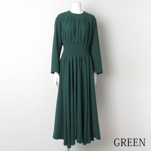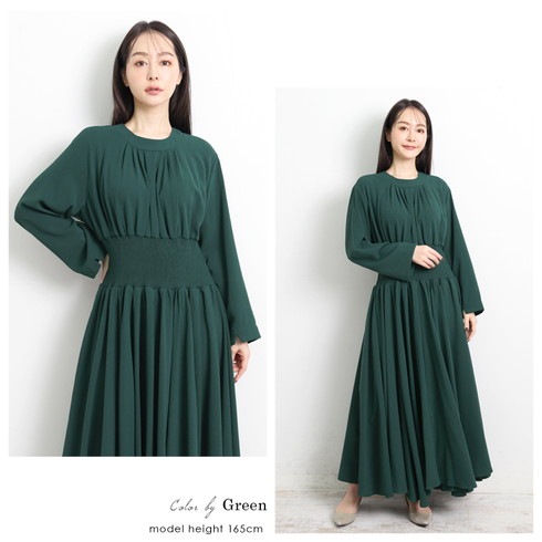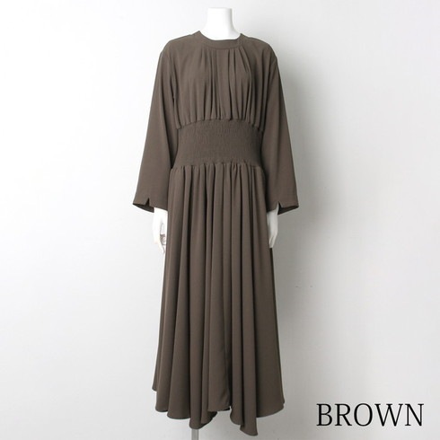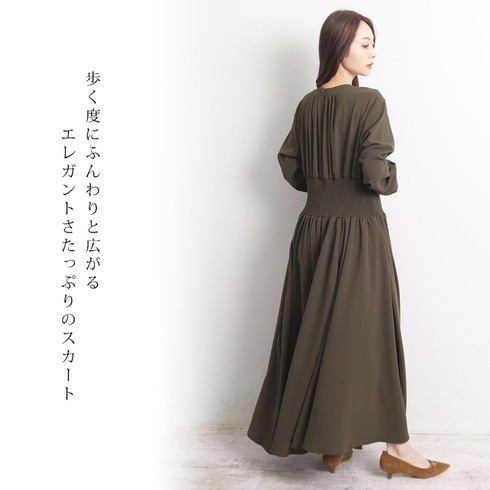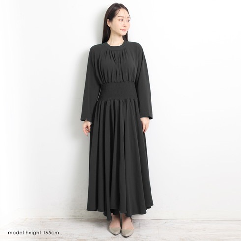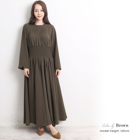 マキシ丈のシャーリングウェストワンピースです。