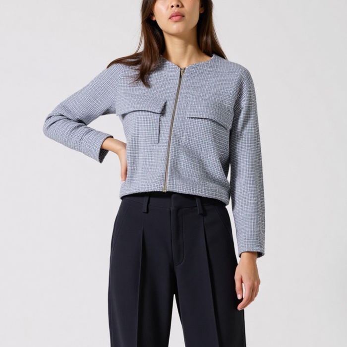 きれいめ上品なノーカラーに前ファスナーでスタイリッシュさをプラス。