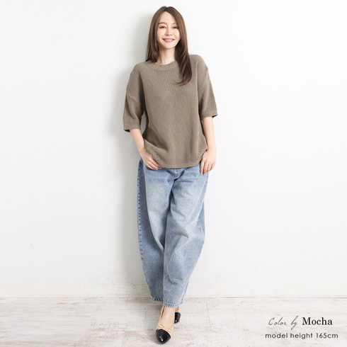 立体的な畦編みニットなので体のラインを拾いにくく体型カバーも◎。