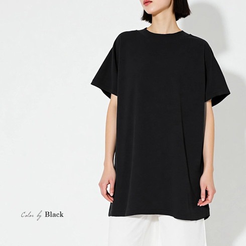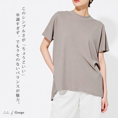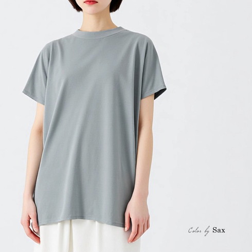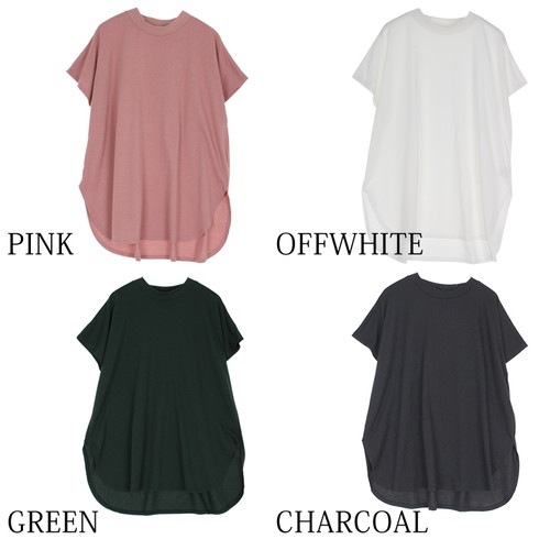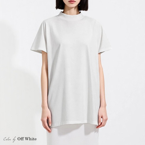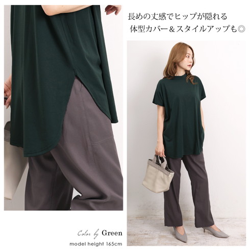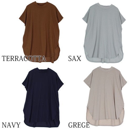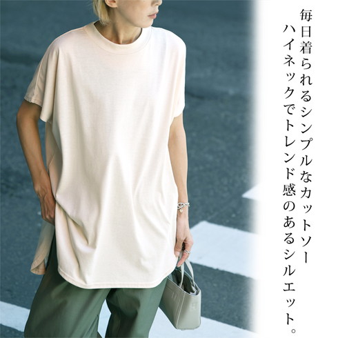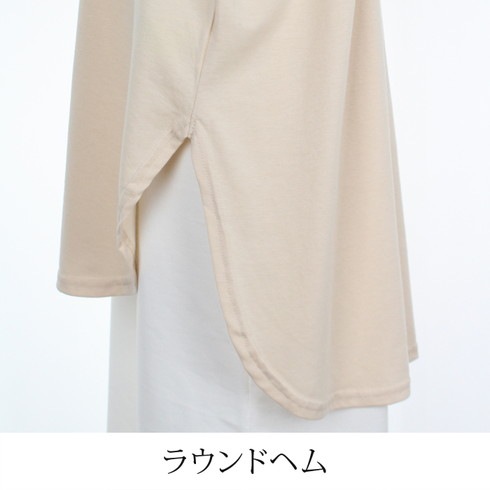 ヒップが隠れる前後差丈とボトルネックがポイントのトップスです。